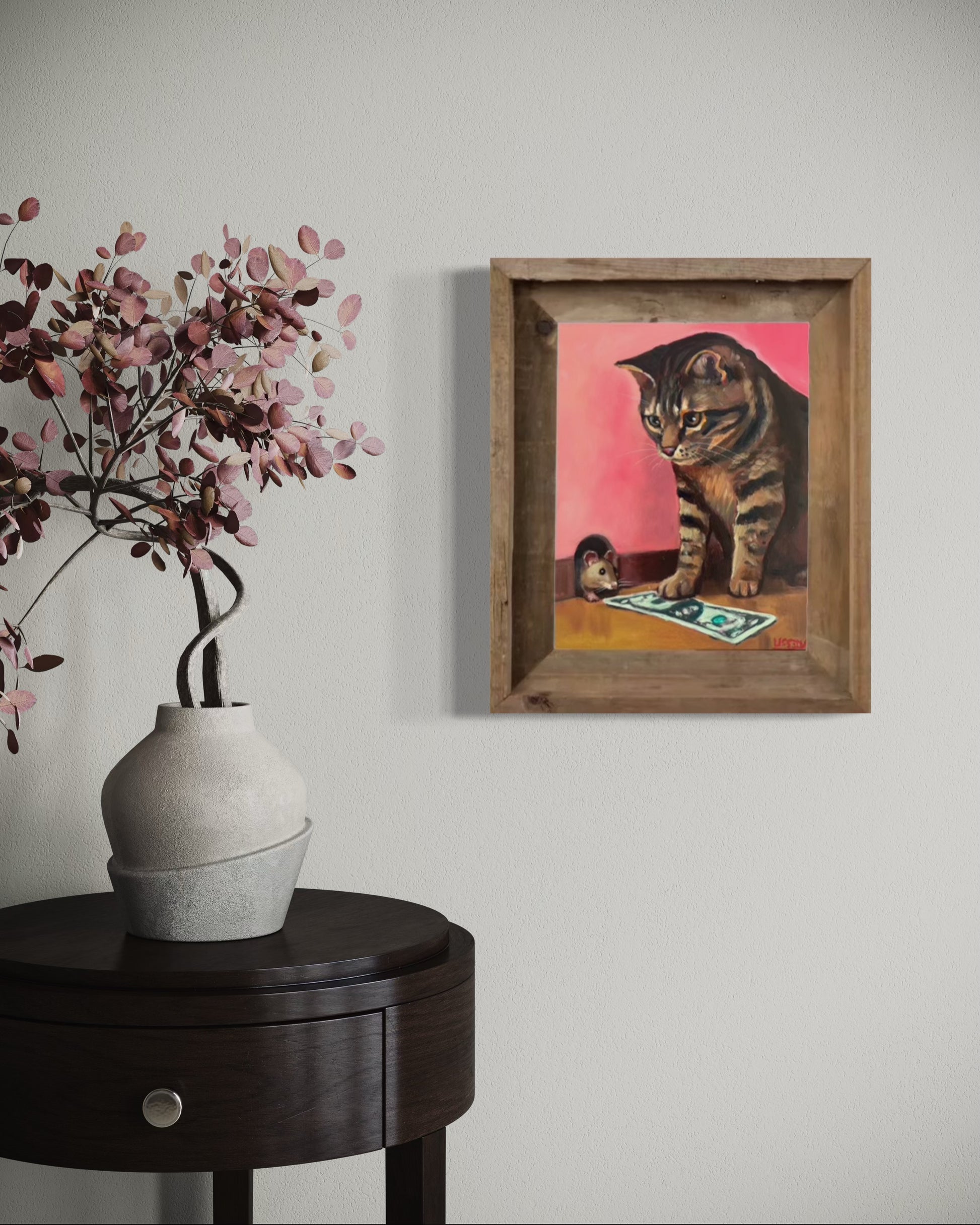 This whimsical yet symbolic scene features a mouse peeking out from its hole, grasping for a dollar bill while a stern tabby cat plants a paw firmly on the cash. The tension between the characters invites deeper reflection on ambition, control, and the daily hustle. Who really holds the power—and what does it take to break free?